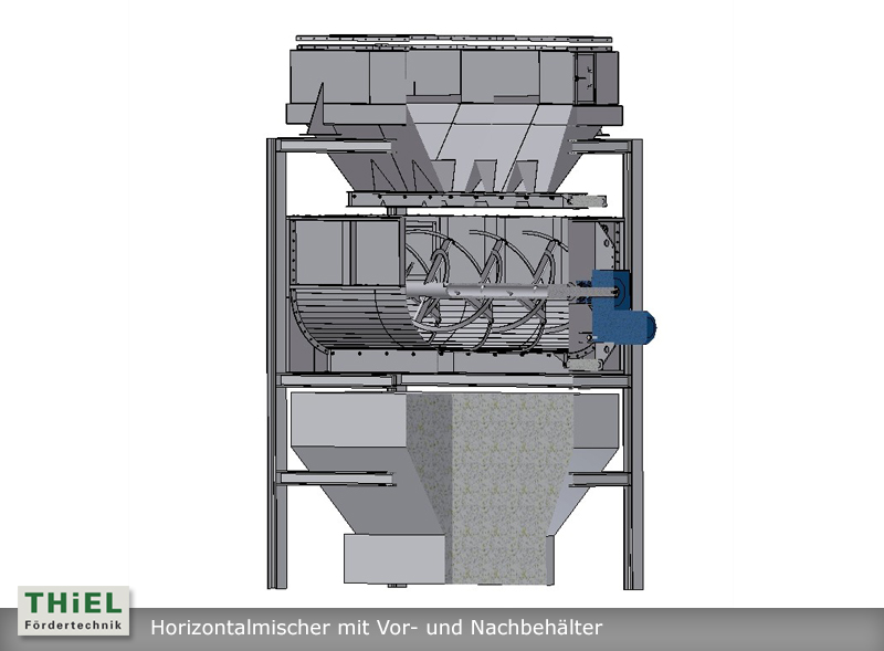 Die Thiel-Horizontalmischer sind Einwendel- oder Doppelwendelmischer in horizontaler Ausführung. Sie sind zum Mischen von unterschiedlichen Komponenten und Schüttgütern geeignet. Hohe Mischkultur, sowie kurze Durchlaufzeiten werden durch den Einsatz von gegenläufigen Windungen erzielt. Thiel-Horinzontalmischer sind lieferbar mit Fassungsvermögen von 1.000 bis 10.000 Liter.
